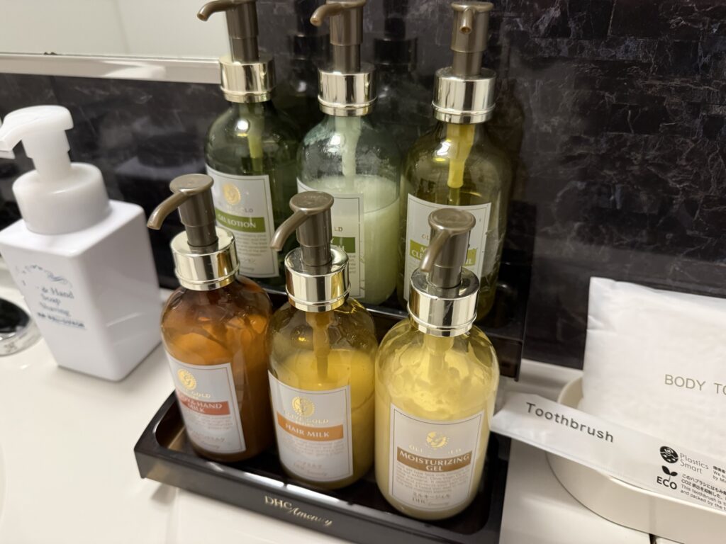 確かレディースルームで予約したため、DHCの化粧水など一式が揃っていてうれしかったです。
