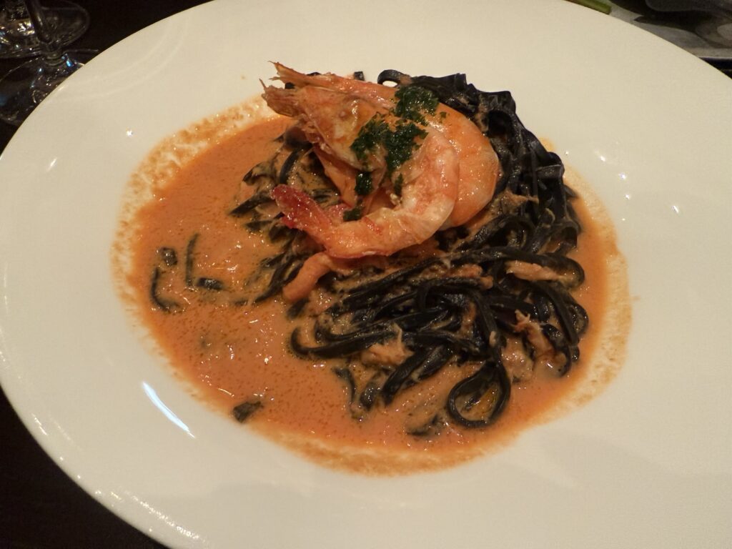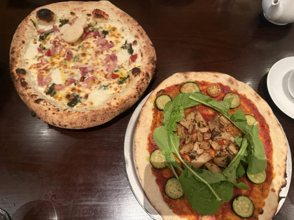 イカ墨のタリオリーニを1人1皿ずつ注文し、シェフおすすめピッツァとピッツァ、パラッツォ・カナル(ベジタブル)をシェア。