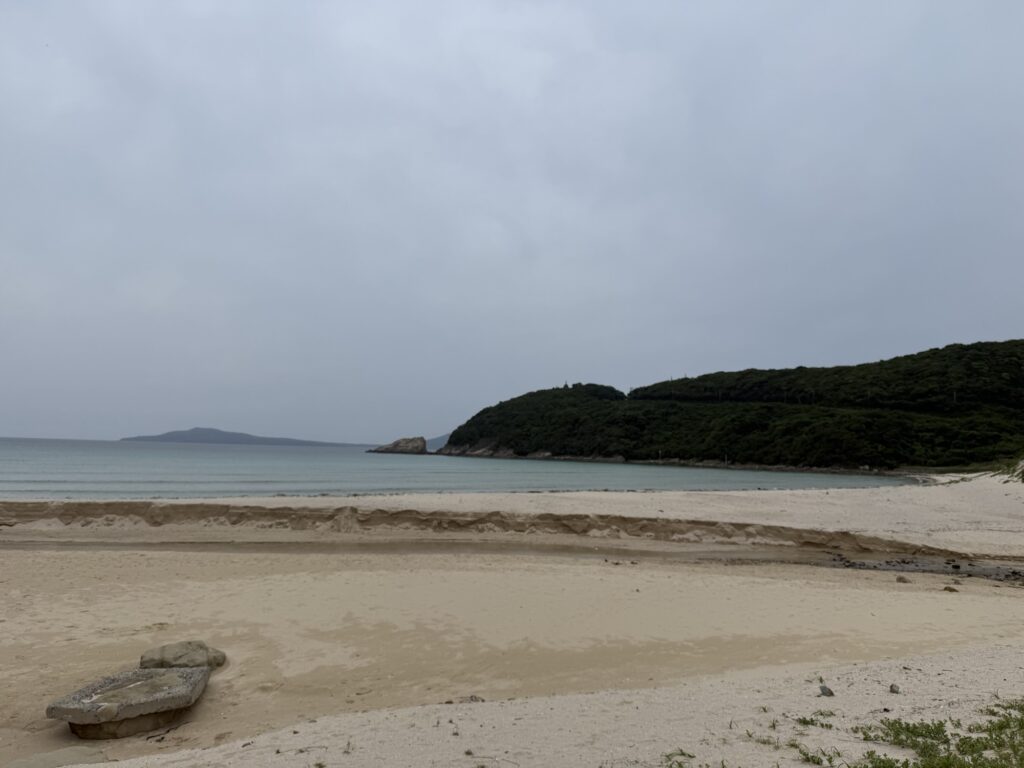 福江島でも特に人気の高い絶景スポットが「高浜海水浴場」。白い砂浜と透明度の高いエメラルドグリーンの海が広がり、「日本一美しい海水浴場」と称されることもあるほど。あいにく天気は曇りでしたが、綺麗な砂浜と海が目の前に広がりました